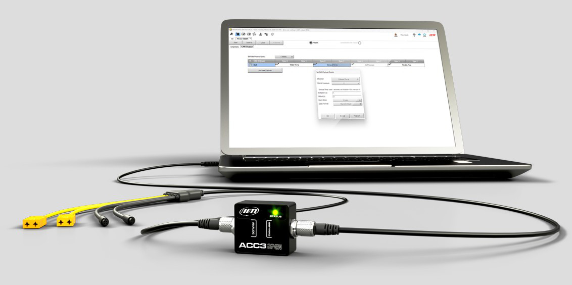 | ACC3 Open allows to build a CAN Output to communicate with external devices. You can set bit rate protocol, field messages and CAN payload details.