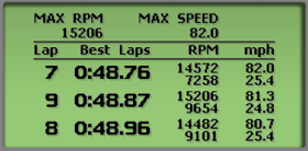 At the end of each session, you can recall the summary of your best laps, with max/min RPM, speed and temperatures. |
