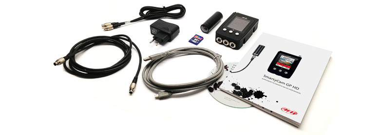 | SmartyCam GP HD Rev. 2.1 recording module, bullet cam connection harness - L=2mt, Mini B - USB adapter cable, battery charger, 4GB HC10 SD card, CD with software, user manual. |